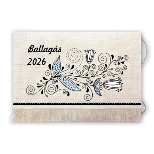 Lenvászon tarisznya, nyomott mintával, natúr színű pamut zsinórral.