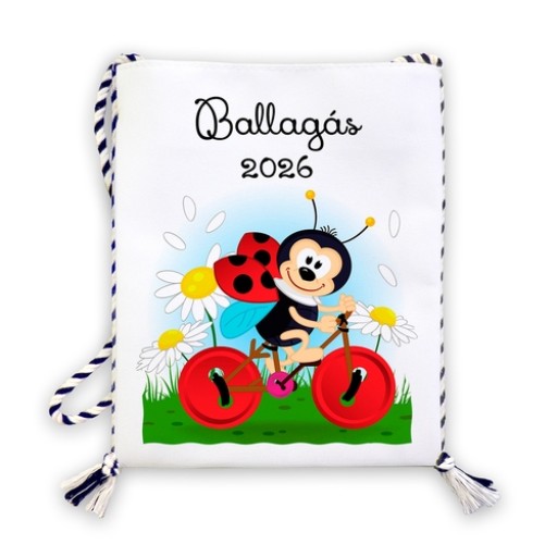 Fehér szövet tarisznya, bicikliző katicával