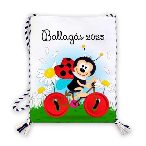 Fehér szövet tarisznya, bicikliző katicával