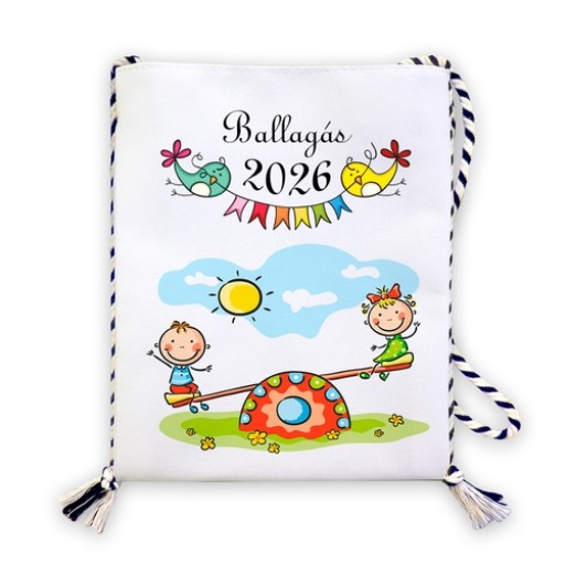 Fehér szövet tarisznya, libikókázó gyerekekkel.
