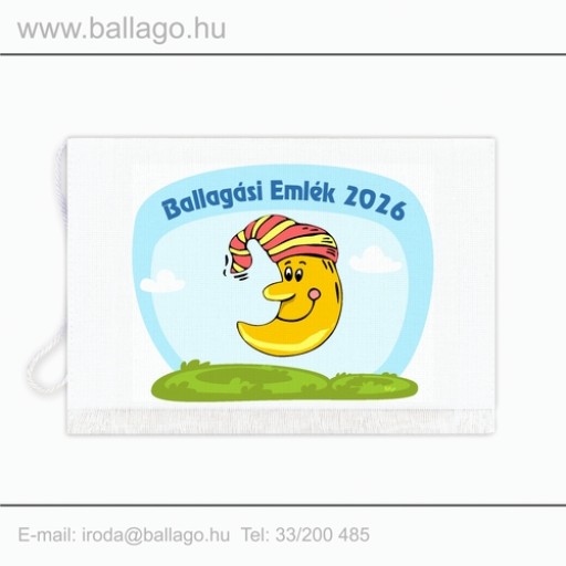 Ovisjeles, nyomott fehér vászon tarisznya, fehér zsinórral.