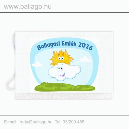 Ovisjeles, nyomott fehér vászon tarisznya, fehér zsinórral.